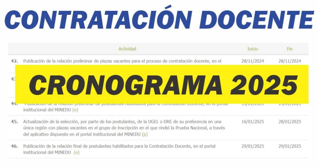 El cronograma establecido por el Minedu para el proceso de contratación docente del año 2025 incluye las siguientes etapas: